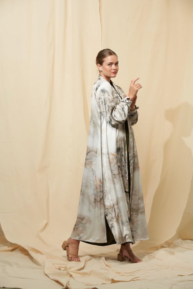 الوجه الأول قماش حرير ياباني ملون عالي الجودة يغلب عليه اللون الزيتي