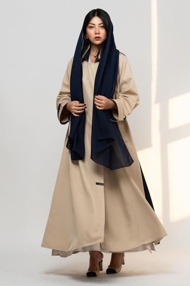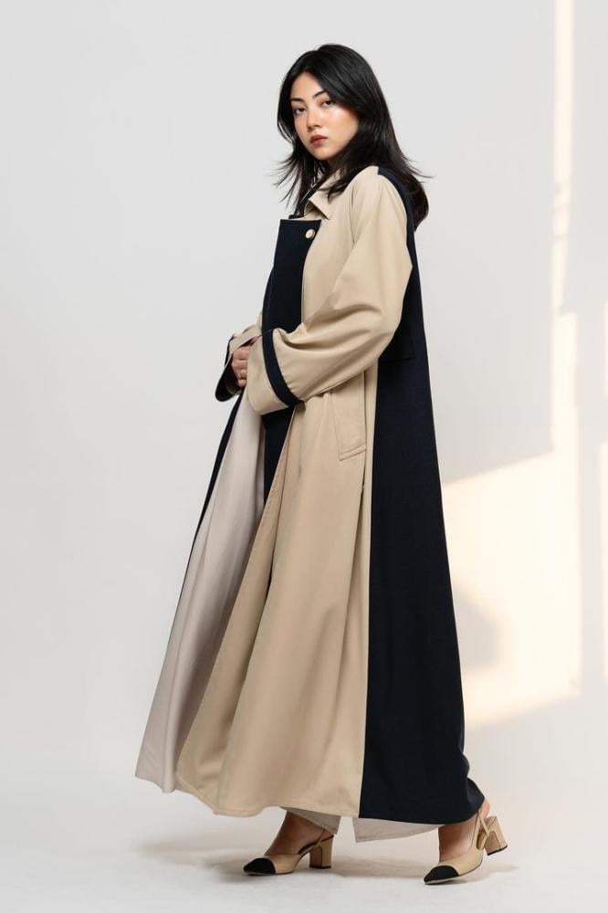 Fabric: العباءة ترانش كوت باللون البيج , وبتداخلات اللون الكحلي .